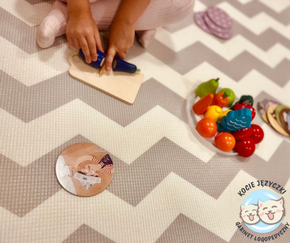 Podczas zajęć gotujemy obiad 🍽️. Dziecko „kroi” warzywa, a po każdym krojeniu losuje kartę i wykonuje ćwiczenie artykulacyjne. Świetnie sprawdzają się karty „Pucio – logopedyczne memo”. Co więcej, gramy po swojemu, ponieważ najważniejsze jest dostosowanie zasad do wieku i możliwości dziecka.